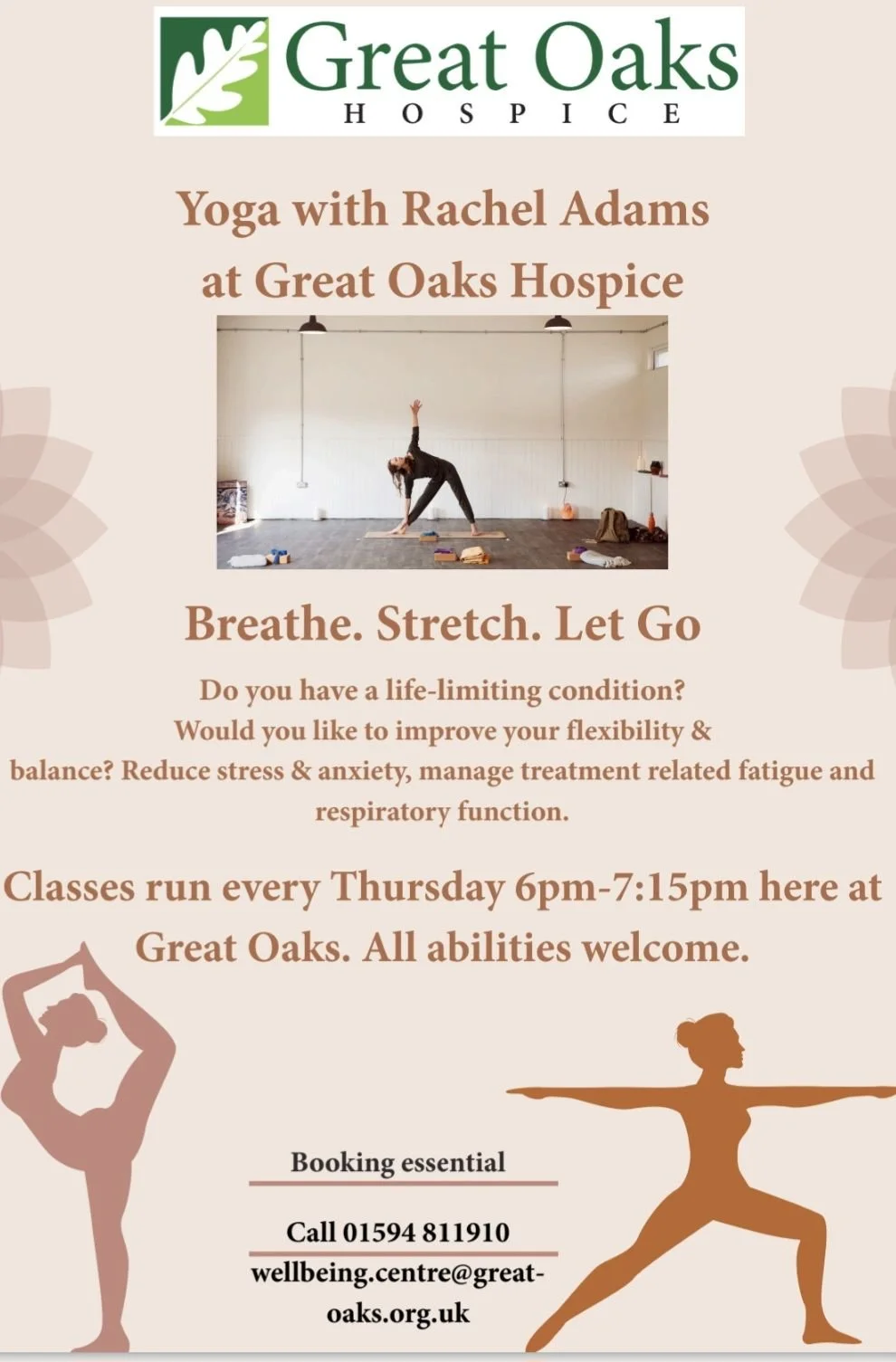 It’s All Yogawith Rach Adams “If you can breathe, you can do yoga.” — PROFESSOR T. KRISHNAMACHARYA Yoga for Everyone. Weekly classes at Great Oaks in Coleford Thursdays 6pm - 7.15pmFor more bookings contact the Community Team directly on 01594 811910. Poster from Great Oaks Hospice, with an image of Rach posing on their mat in a hall, surrounded by yoga props.
